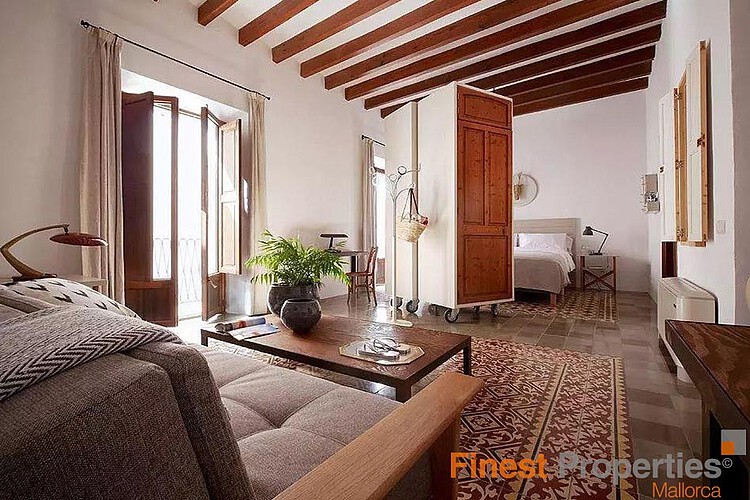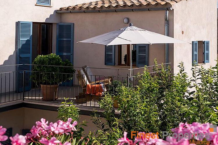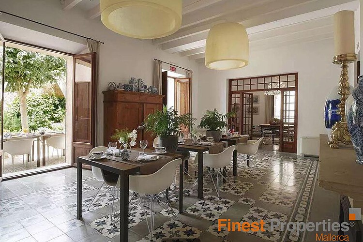 La fachada se restauró con las técnicas y el diseño originales. Desde el típico recibidor mallorquín, con su auténtico suelo de baldosas, una hermosa escalera Art Nouveau conduce a las habitaciones de la primera planta. Hay cinco espaciosas habitaciones, cada una con su propio baño, una en la planta baja y las demás en la primera. La sala de estar y el comedor se encuentran en la planta baja, con vistas al jardín. Cuando hace buen tiempo, se puede disfrutar del desayuno al aire libre. La fresca terraza mediterránea, con sus diversos rincones acogedores, es perfecta para relajarse. El jardín también cuenta con un solárium de 60 m² con impresionantes vistas al pueblo y a la Serra de Tramuntana. El hotel aún conserva algunas zonas sin reformar que podrían destinarse a habitaciones adicionales o a ampliar su oferta. También es posible construir una piscina en el jardín.