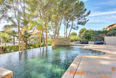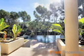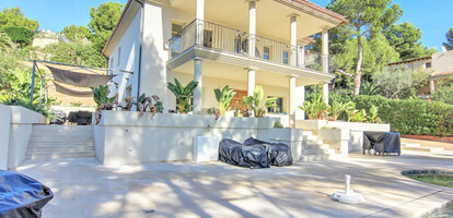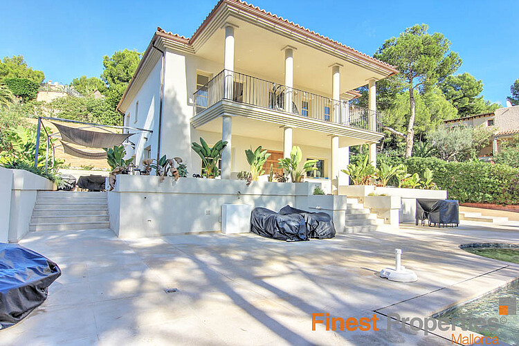 Costa de la Calma es una zona residencial ubicada entre Santa Ponsa y Paguera, en el suroeste de Mallorca, con excelentes conexiones con Palma. La vivienda, construida en 2001 sobre una parcela de aproximadamente 2.000 m², fue reformada en 2023. Sus aproximadamente 380 m² de superficie construida se distribuyen en dos plantas. La planta baja cuenta con un salón-comedor con cocina americana, un aseo de invitados, un apartamento independiente con cocina y baño, y acceso a un despacho. La primera planta consta de una suite principal con vestidor, un dormitorio con baño en suite, otro dormitorio y un baño con bañera. En el exterior, dispone de una piscina infinita de 8 x 5 m rodeada de terrazas cubiertas y descubiertas. Entre sus características destacan los suelos de piedra natural, aire acondicionado frío/calor y calefacción central de gas (radiadores).