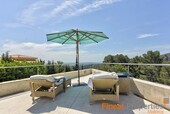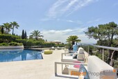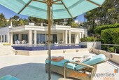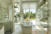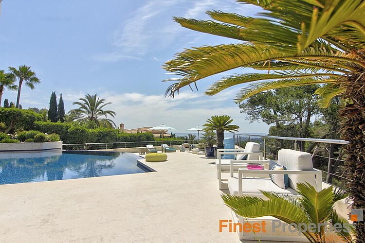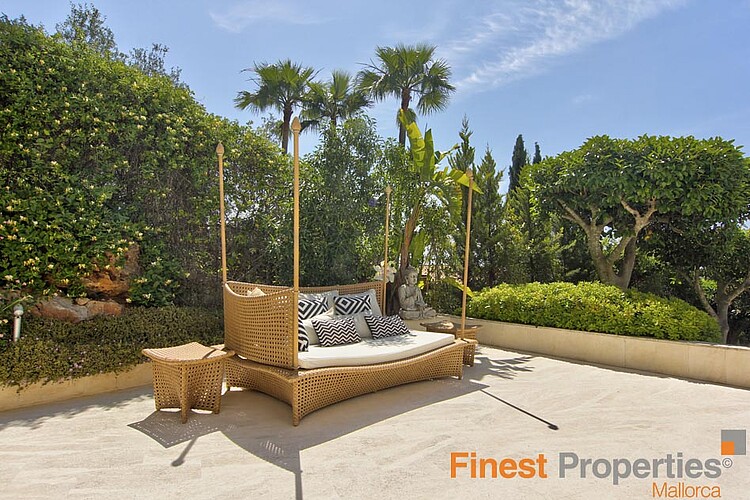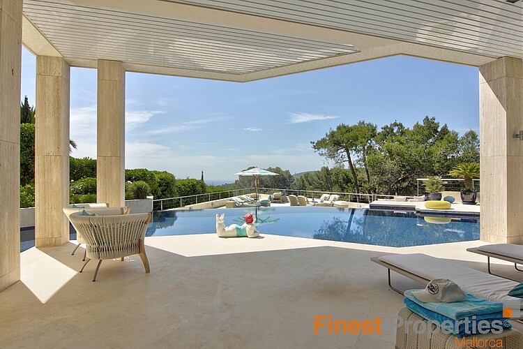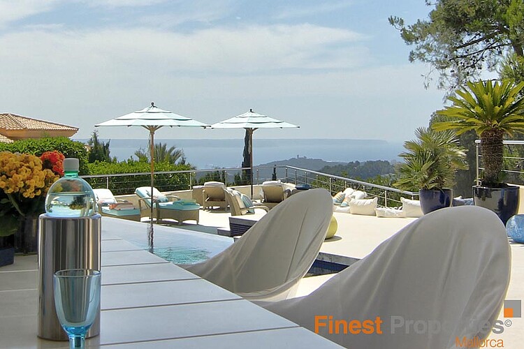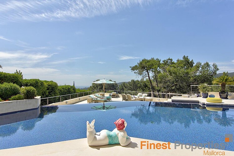 La lujosa y vigilada zona residencial de Son Vida se encuentra a tan solo 3 km de Palma y está rodeada de 3 campos de golf y dos hoteles de 5 estrellas. Esta villa moderna fue construida con materiales de alta calidad en una parcela de 2.350 m² en la ladera. Los aproximadamente 650 m² de superficie habitable se distribuyen en 2 plantas. La entrada está en la planta baja. En el hall de entrada, que está abierto en la parte superior, puede llegar al primer piso a través de una elegante escalera o cómodamente con el ascensor. Aquí se encuentra un amplio y luminoso living comedor con vista a la terraza de 300m y una gran piscina. Impresionante desde aquí es sin duda la hermosa vista panorámica de Palma y el mar. En este nivel hay una cocina moderna con isla de cocción (con nevera para vinos, horno Gaggenau, etc.), una biblioteca (sala de TV), el dormitorio principal con 2 vestidores y un baño y 3 dormitorios de invitados, cada uno con un baño en suite. En el exterior hay terrazas abiertas y cubiertas con varias zonas de descanso, una ducha al aire libre y acceso a una terraza en la azotea de 300 m², a la que también se puede llegar en ascensor. La terraza es ideal para fiestas en casa o una fiesta en la azotea con amigos que se sorprenderán con las vistas panorámicas. En la planta baja también hay una oficina, una sala de meditación, un baño con inodoro y ducha, una terraza cubierta, una habitación que sería adecuada como sauna y salas técnicas. Un apartamento de invitados independiente de unos 50 m² con salón, cocina, dormitorio y baño está disponible para invitados. El equipamiento incluye suelo radiante (gasoil), aire acondicionado f/c, ventanas correderas panorámicas de aluminio, rejas de tijera, sistema de alarma y sistema solar para agua caliente. Hay espacio para 2 coches en la cochera cubierta. La adquisición de muebles, así como de objetos de arte y cuadros de artistas conocidos es negociable. .